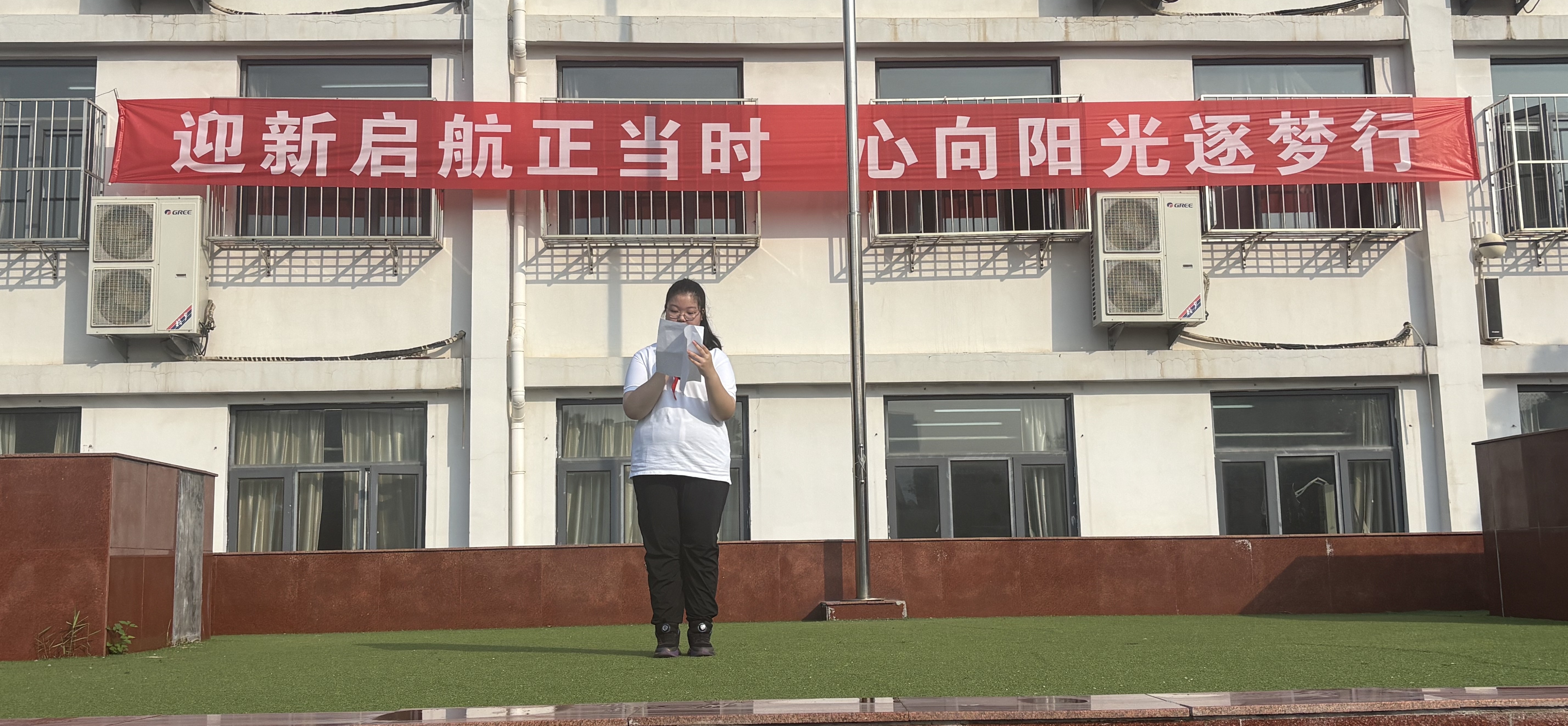 国旗下演讲环节,突出迎新启航的主旋律,由七年7班张钊情同学作为新生代表登台。“今天,我们从四面八方汇聚于校园,既是新起点的追梦人,更是校训‘求学报国’的践行者!”她代表全体2025级新生,向即将引领成长的老师们致以崇高敬意,坦言面对中学新征程的期待与忐忑,同时带领新生立下誓言,将以“团结进取 严谨求实”的学风为指引,勤学善思、勇于探索,在知识海洋中乘风破浪。