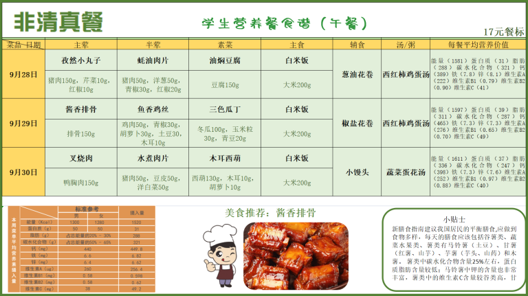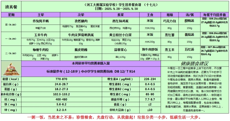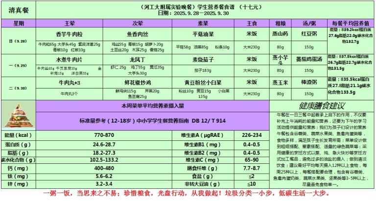 河北工业大学附属实验学校学生餐食谱公示(2025.9.28——9.30)
