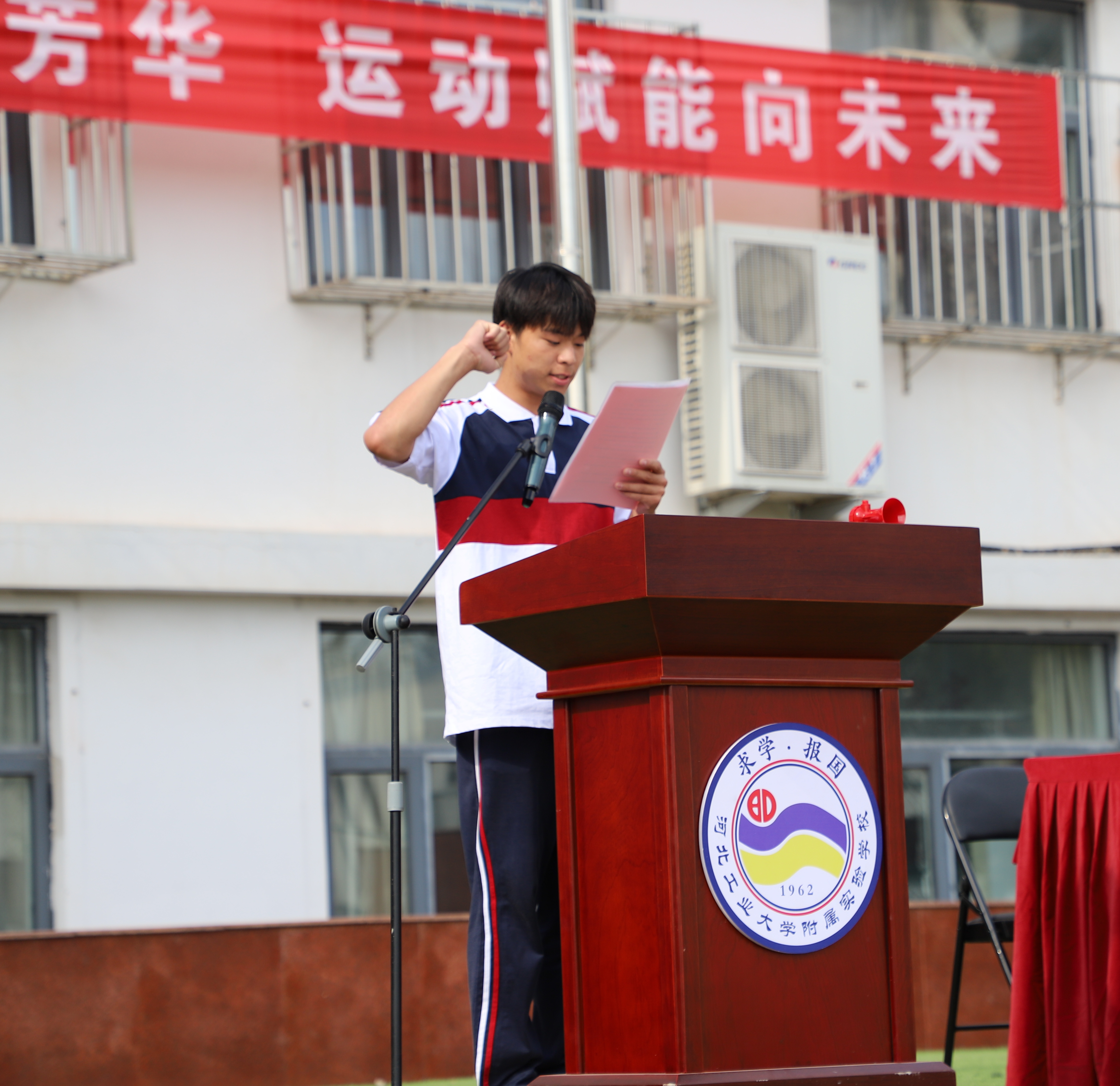 升旗仪式上,全体师生肃立注目,国歌响彻校园,爱国之情与节日期盼在每个人心中激荡。魏校长在致辞中,既回顾学校体育工作的丰硕成果,也寄语同学们以“更高、更快、更强”的体育精神,在赛场上书写青春,为双节添彩。随后,裁判员代表宋颖老师立誓守公平,运动员代表高二3班吕涛承诺展风采,两句誓言为赛事注入精神力量。