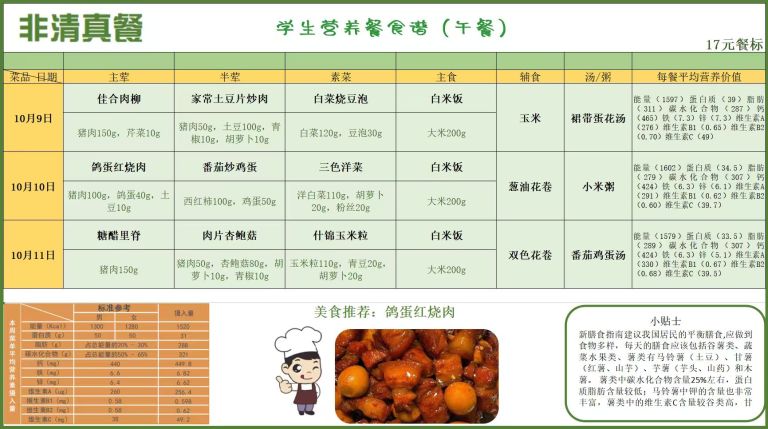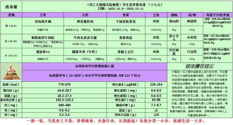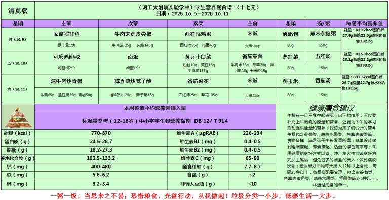河北工业大学附属实验学校学生餐食谱公示(2025.10.9——10.11)