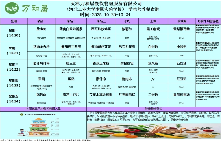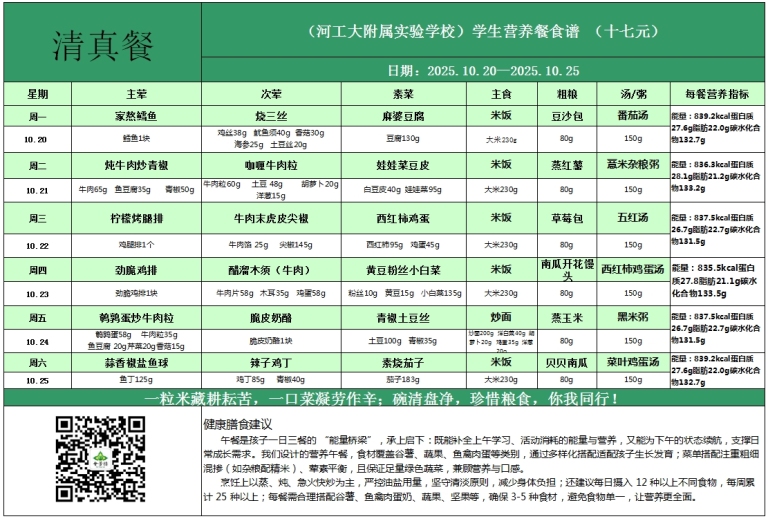河北工业大学附属实验学校学生餐食谱公示(2025.10.20——10.25)
