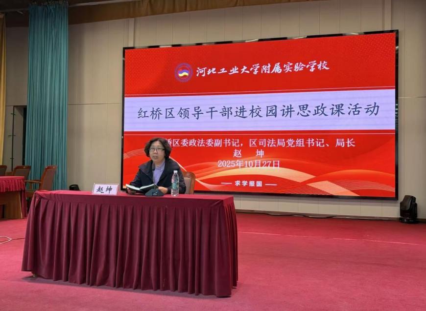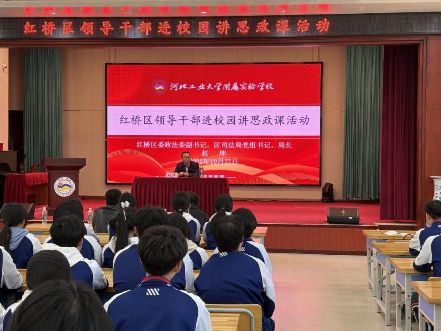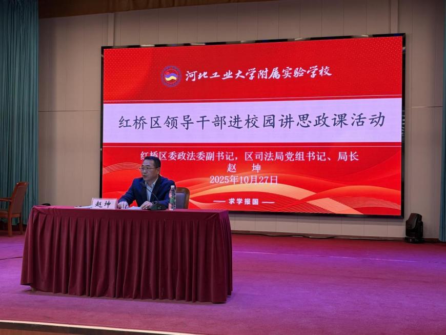 为进一步加强青少年思想政治教育和法治观念培养,营造尊法学法守法用法的校园氛围,10月27日下午,红桥区委政法委副书记,区司法局党组书记、局长赵坤走进河北工业大学附属实验学校,为师生们带来了一堂生动深刻的专题思政课。