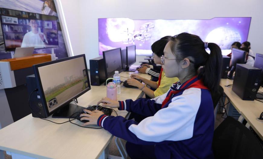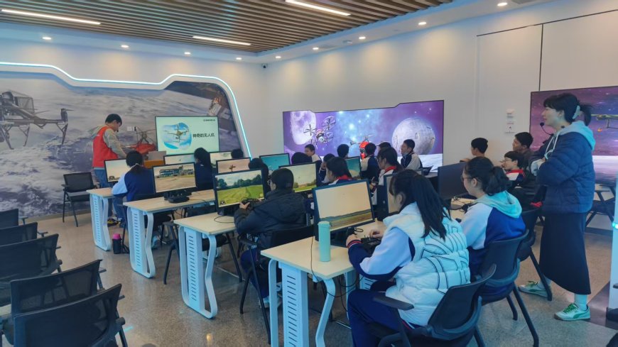 握住航模控制器的瞬间,学生们仿佛跌入了三维渲染引擎织就的虚拟天地。云絮漫卷、地形错落,从起飞时的稳稳悬停,到航线规划时的精准转向,再到应对“虚拟风雨”时的微调操控,俯仰、横滚的每一个动作,都让大家慢慢摸清飞行的“门道”。切换至第一人称视角时,屏幕里的“天空”仿佛伸手可及,无人机的空间定位原理,也从书本上的文字,变成了掌心可感的震颤。