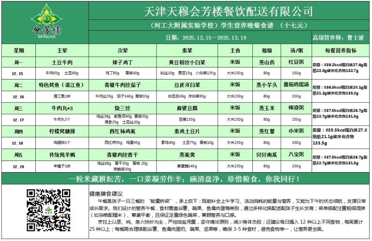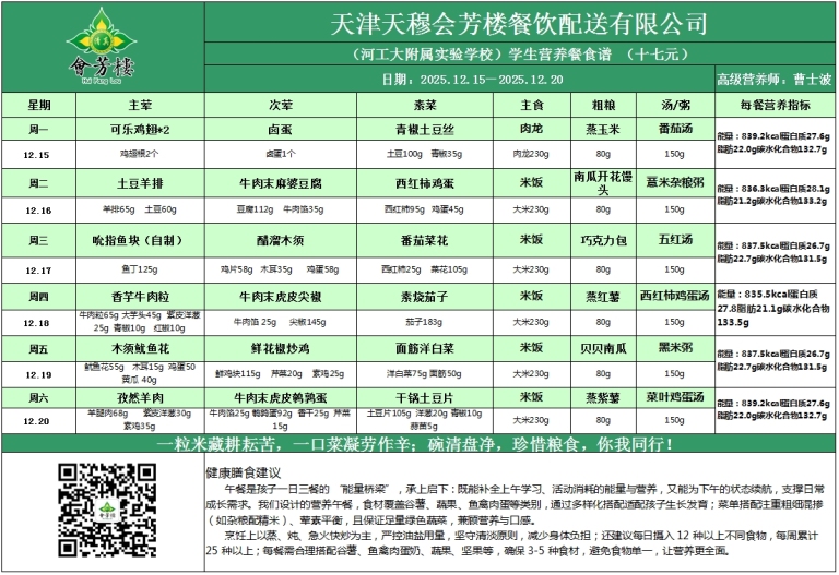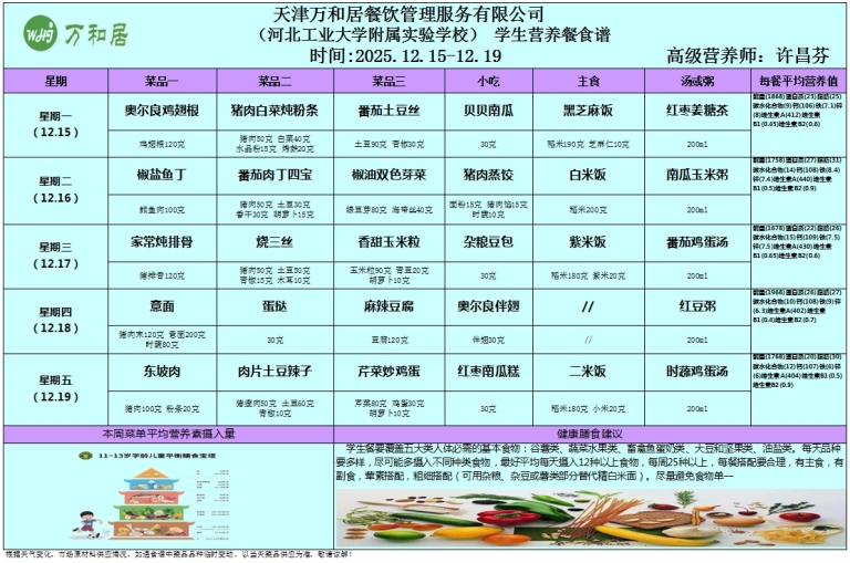 河北工业大学附属实验学校学生餐食谱公示(2025.12.15——12.20)