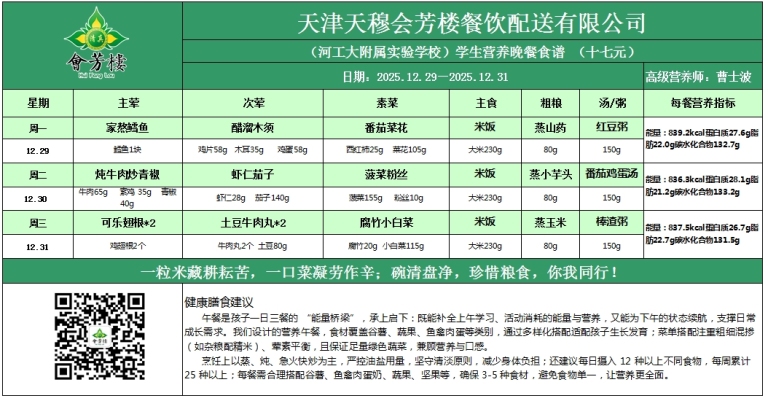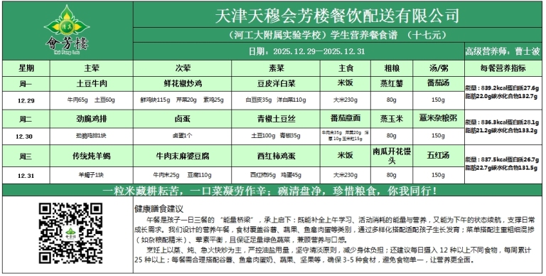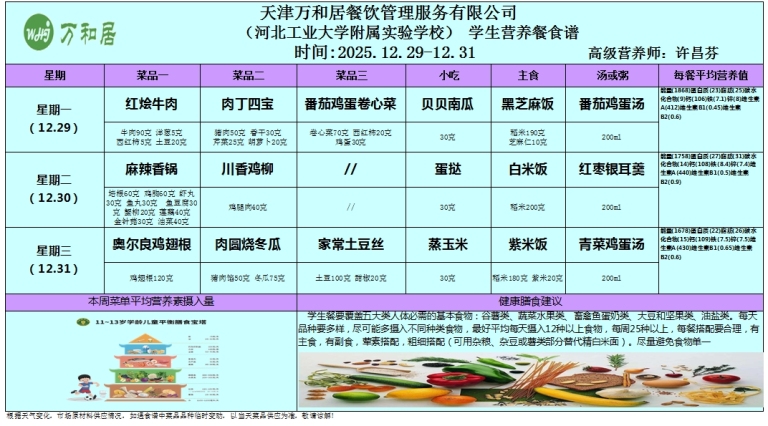 河北工业大学附属实验学校学生餐食谱公示(2025.12.29——12.31)
