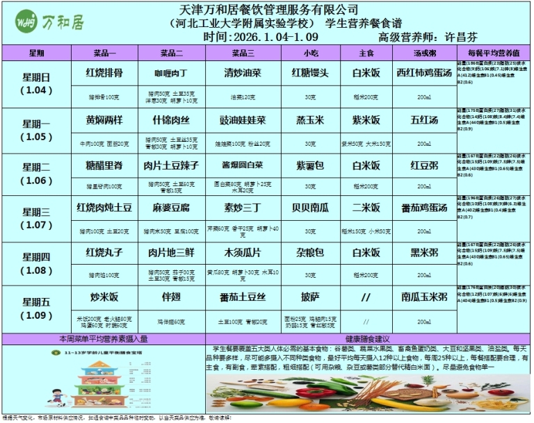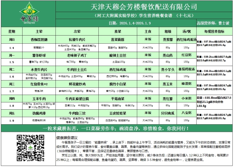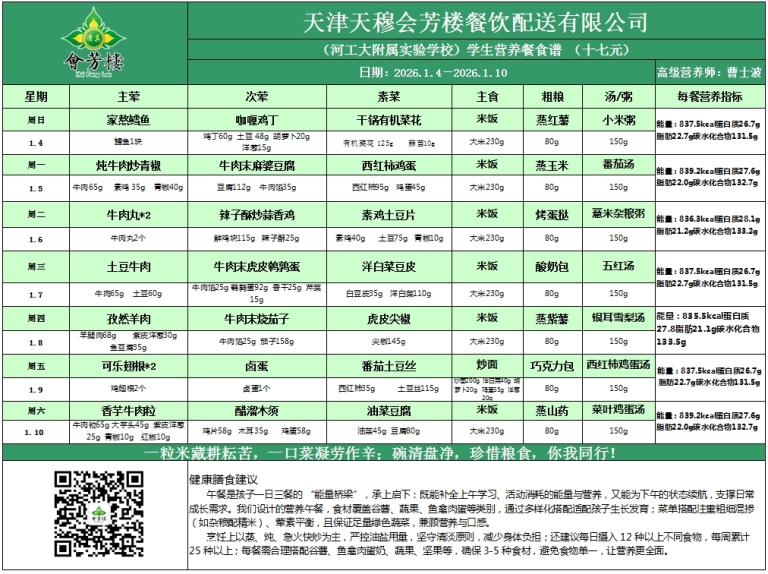 河北工业大学附属实验学校学生餐食谱公示(2025.1.4——1.10)