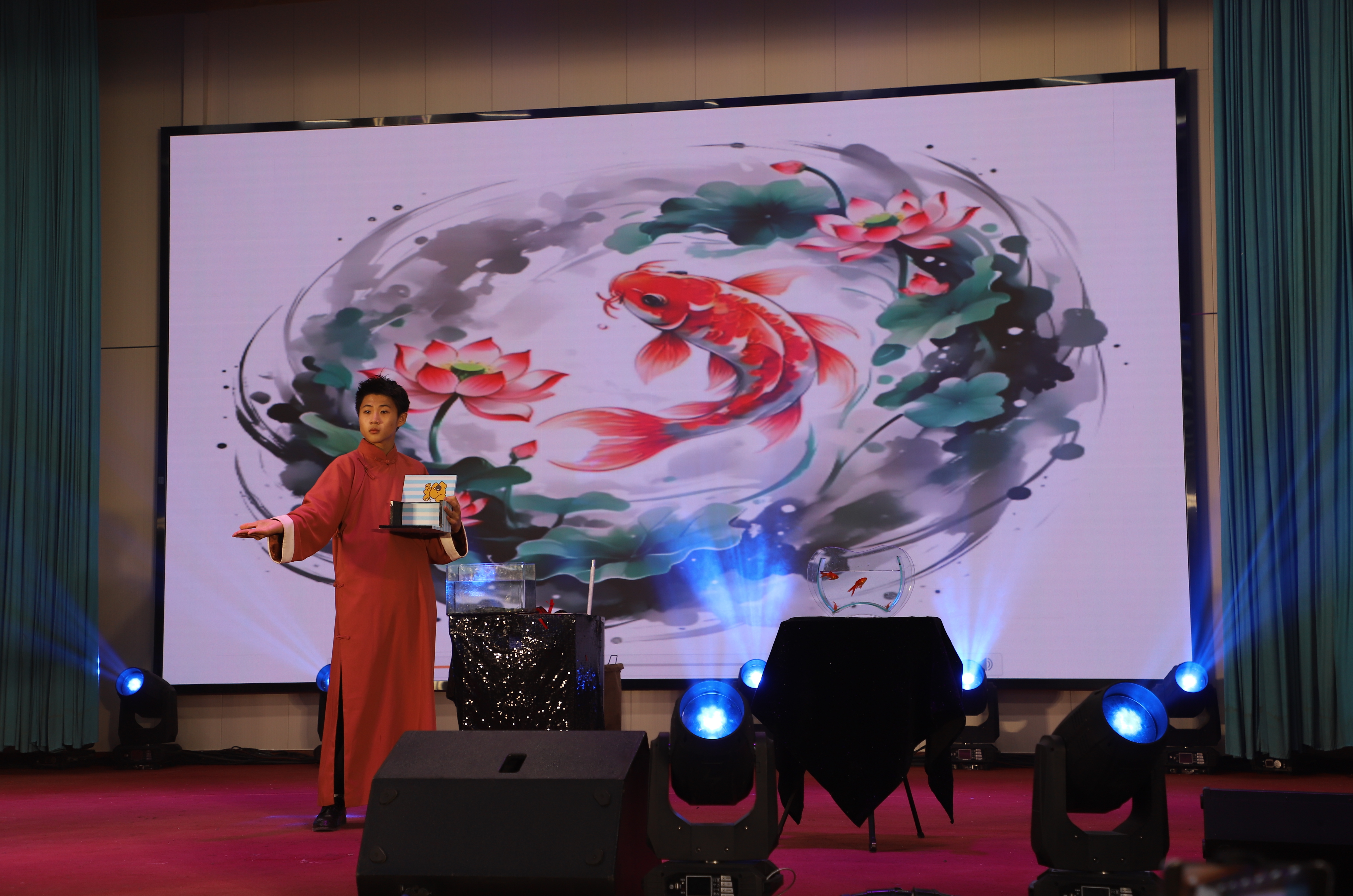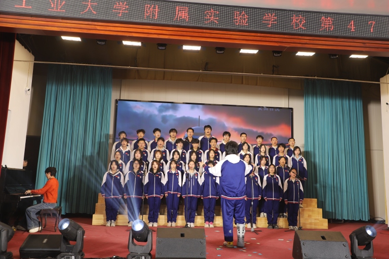 高一 4 班王昱博带来的魔术《年年有余》堪称整场晚会的“惊喜炸弹”。他时而将锦盒在空中翻转,时而用丝巾轻轻遮掩,指尖翻飞间,锦鲤图案在道具上忽隐忽现,悬念层层递进。当他猛地掀开盖布,金红色的小金鱼在透明鱼缸中欢快游动时,全场瞬间爆发出雷鸣般的掌声,低年级同学更是激动地站起身挥手,这份将传统文化中 “年年有余” 的吉祥寓意与青春创意结合的巧思,赢得了满堂喝彩。八年级刘馨锘、彭律洁、穆昱彤、赵思语四位同学的朗诵《青春筑梦山河同心》震撼登场。四人并肩伫立在追光之下,他们的声调时而激昂如战鼓,时而深情如流水,手势配合默契——抬手是“指点江山”的豪情,握拳是“不负韶华” 的坚定,眼神中闪烁着少年人独有的澄澈与执着。高一 4 班的小品《大城小事》则画风一转,以贴近生活的剧情引发共鸣。三人台词幽默接地气,肢体动作自然生动,当剧情走到“爱家护家”的温情时刻,台下响起会心的笑声与阵阵掌声,让大家在轻松氛围中领悟到“小事见真情”的道理。最后,高二4班的大合唱《歌唱祖国》以磅礴气势收尾。同学们身着整齐的校服,以整齐的队列站满舞台,全场合唱如浪潮般席卷整个会场,“五星红旗迎风飘扬,胜利歌声多么响亮”的旋律激昂高亢,台下观众纷纷起立一同合唱,爱国之情在歌声中激荡,将整场艺术节的气氛推向顶点。