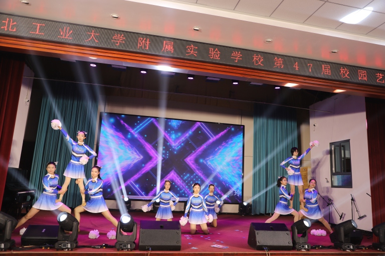 青春活力在舞台上尽情绽放。八年2班和6班的合唱《童年》率先登场。前奏一响便唤醒全场记忆,轻快悠扬的旋律如春日暖风拂面,同学们站姿挺拔、眼神清澈,稚嫩而真挚的歌声里满是纯粹与烂漫。高二 1 班康铭轩的舞蹈《hollywood action》瞬间点燃全场,强劲的节奏、利落的动作、自信的笑容,每一个舞姿都充满力量感,灯光随舞步闪烁变幻,台下观众的掌声与呐喊声此起彼伏,青春的热烈与张扬扑面而来。高二 1 班的另一位同学林炆馨演绎的《俏》则另具韵味,灵动的舞步搭配俏皮的表情,粉色裙摆随动作飞扬如花瓣轻舞,将少女的活泼灵动与青春娇俏展现得淋漓尽致。七年2班李沁带来的独舞《夜之舞》紧随其后,为舞台注入别样韵味。音乐响起,李沁踮脚旋身,手臂舒展如夜鸟振翅,舞步轻盈似月光流淌,时而俯身轻旋,时而跃起舒展,每一个动作都精准而富有感染力。台下观众屏息欣赏,生怕惊扰这份专属夜晚的美好。啦啦操社团的同学们身着统一的亮色系服装,手持彩色花球,整齐划一的动作如波浪起伏,跳跃、旋转、托举等招式精准有力,饱满的热情、灿烂的笑容感染着在场每一个人,将现场气氛推向高潮。八年级学子演绎的吉他弹唱《稻香》清新治愈,木吉他的和弦温柔流淌,同学们围站成圈,清澈的歌声里满是青春的向往与纯粹,台下不少观众跟着轻轻哼唱,青春的共鸣在空气中久久弥漫。