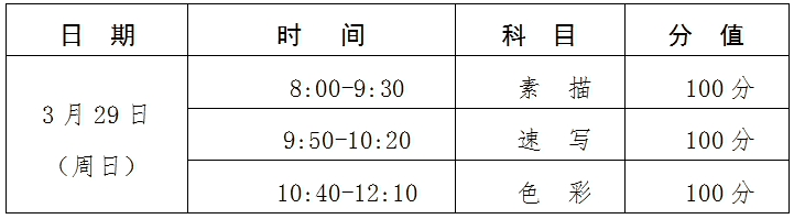 (2)考生需自备画板、画架(考场内有学生桌椅)、绘画铅笔、炭笔、水粉颜料、水粉画笔、色盒、调色板(调色纸)、涮笔桶、橡皮、胶带、黑色水笔等。