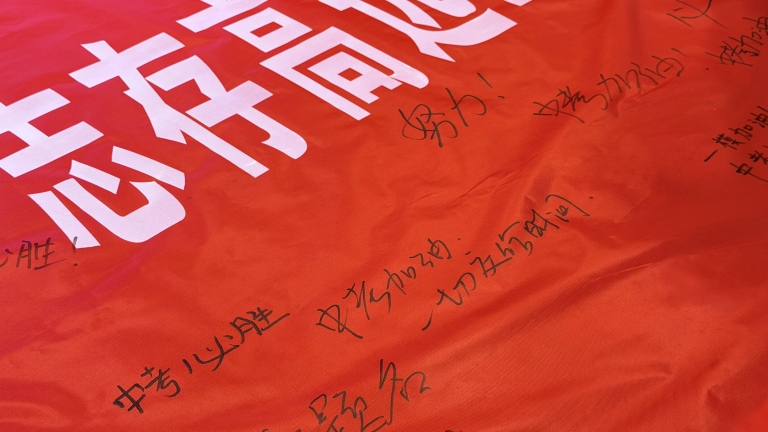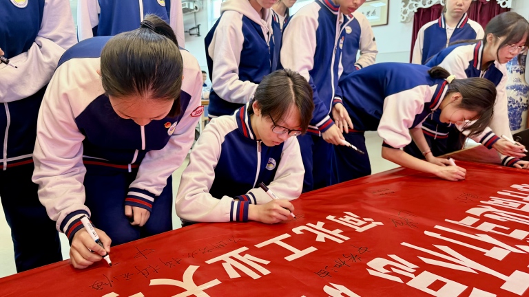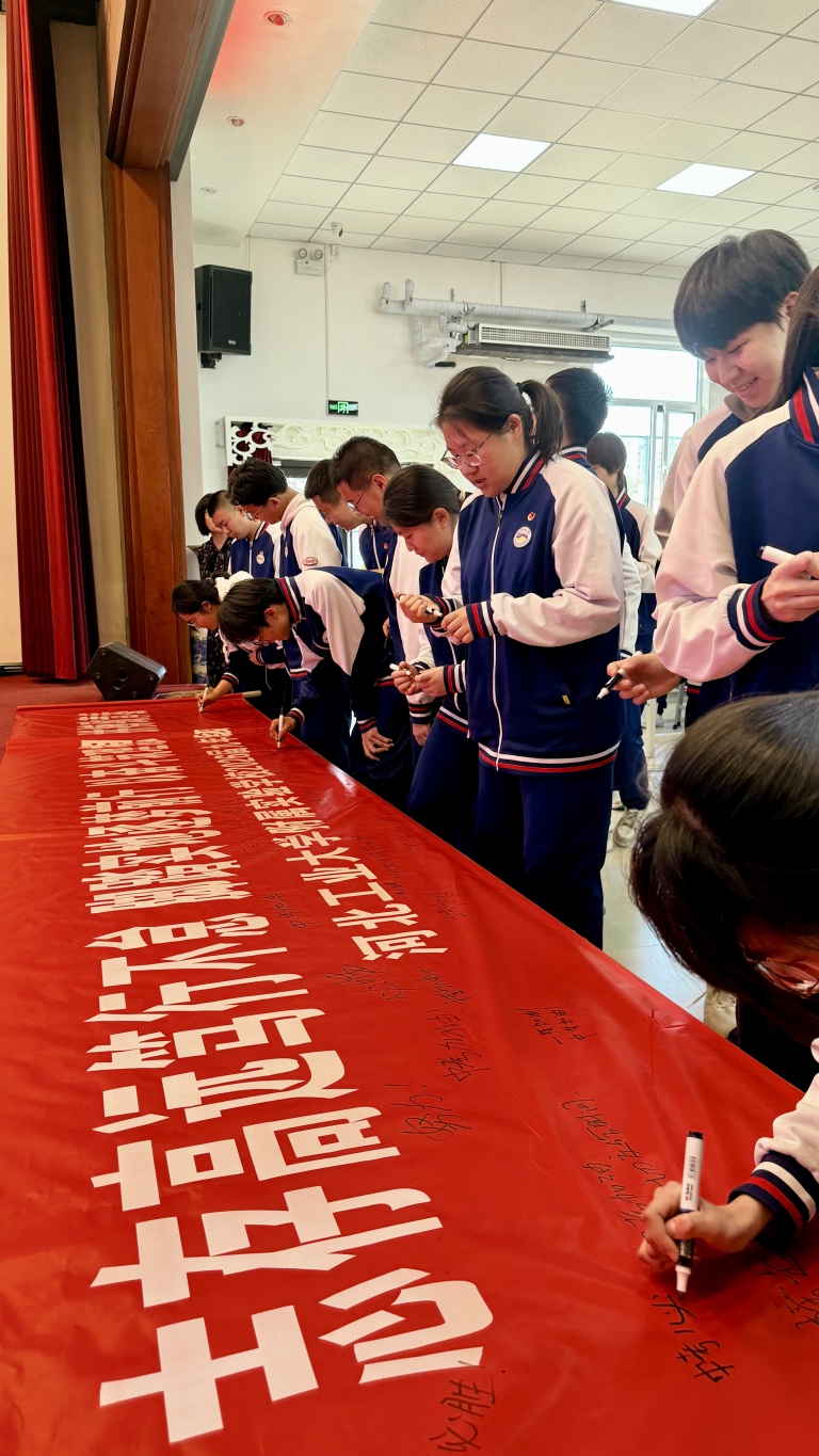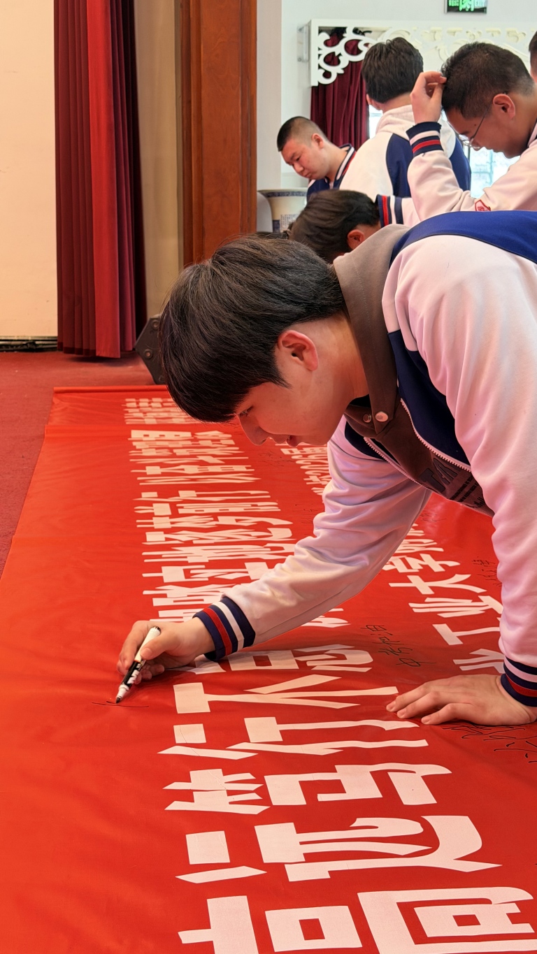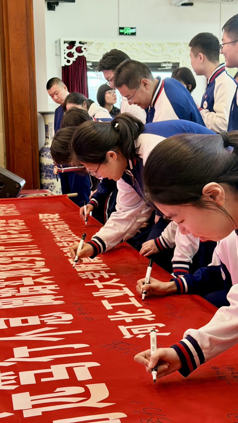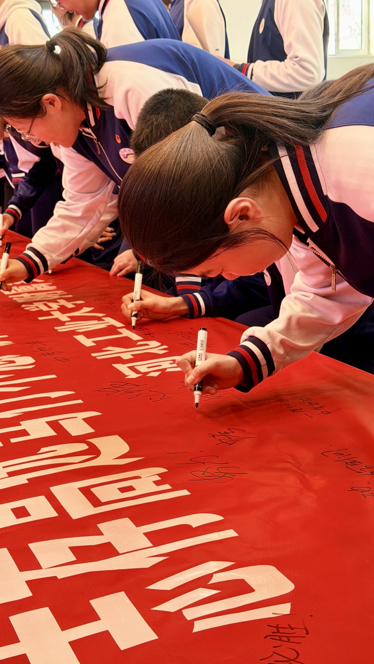 校长讲话后,各班依次喊出铿锵有力的奋斗口号,震彻全场的声音,彰显了九年级学子的青春豪情。随后,校领导、教师代表与各班学生代表上台,在“志存高远笃行不怠,脚踏实地逐梦前行”主题横幅上写下寄语,一笔一画承载着期许,一字一句凝聚着力量,留下了属于青春与奋斗的专属印记。